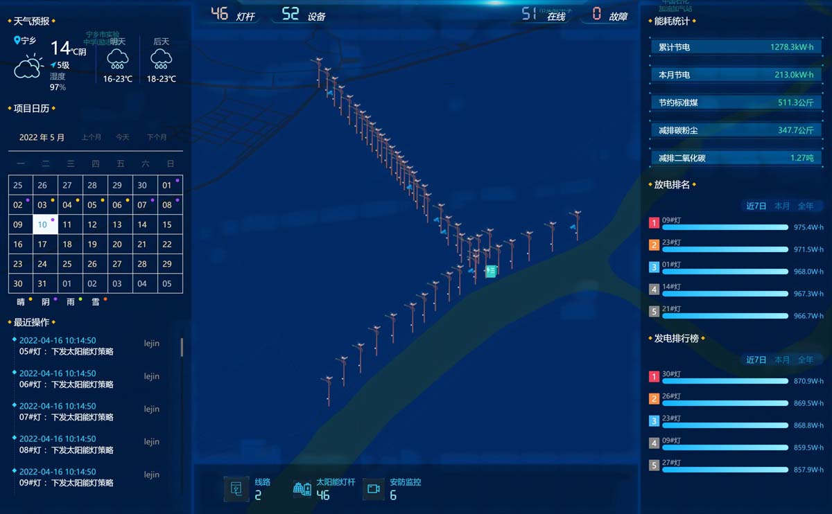 本項目根據寧鄉某社區當地的屋場特色,將路燈量身設計為荷花造型,公司無償提供了路燈設計、平臺運營服務,為社區照亮了通向鄉村振興的道路。智慧源于路燈功能的多元,其智慧太陽能路燈運營管理平臺能實現照明遠程控制、安防監控等多個功能,凸顯了智慧鄉村的特色。平臺可監控所有燈桿及掛載設備的運行狀況,自動調節亮度和開關時間;同時燈桿上掛載的攝像頭能實現實時視頻監控錄像,對于鄉村的安防溯源取證有重要作用。