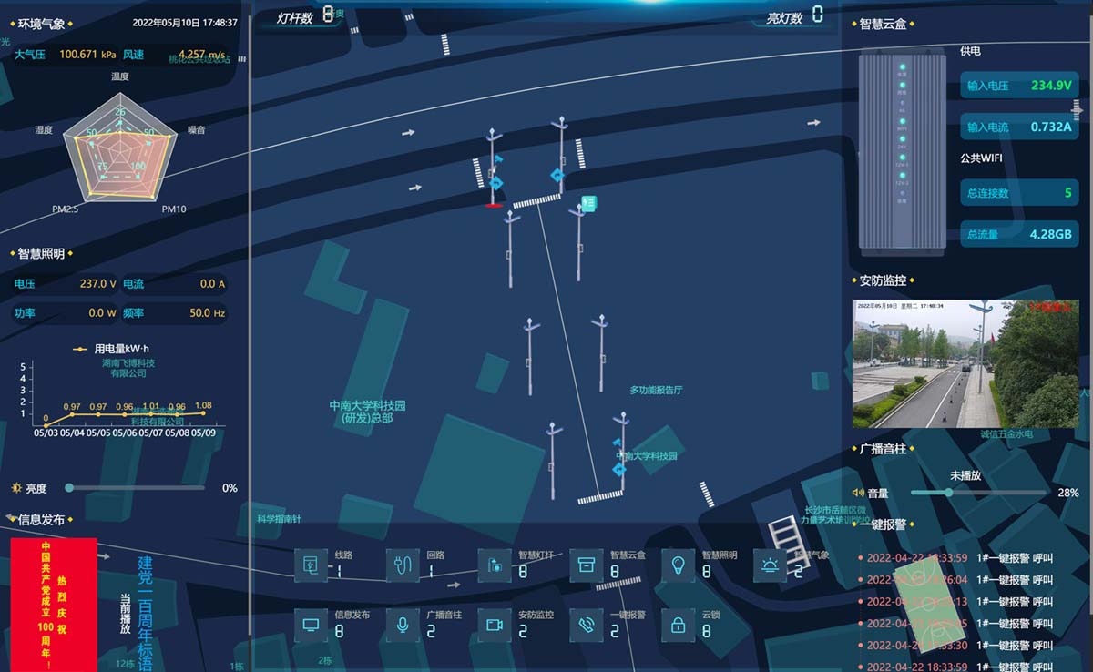 本項目為中南大學科技園(研發(fā))總部升華大道建設8套智慧多功能桿,以智慧多功能桿為載體,采用物聯(lián)網(wǎng)、云計算、大數(shù)據(jù)和地理信息等技術(shù),結(jié)合LED照明、環(huán)境氣象傳感器、智能網(wǎng)關、LED信息發(fā)布屏、網(wǎng)絡音柱、監(jiān)控攝像機、一鍵呼叫、云鎖、5G微基站(預留)等多種終端智能設備,實現(xiàn)智慧照明、環(huán)境監(jiān)測、信息發(fā)布、公共廣播、智慧安防等綜合功能,打破信息壁壘,建設數(shù)據(jù)信息集成式的智慧多功能桿運營管理平臺,實現(xiàn)遠程、實時、精準的全方位智能化園區(qū)管理,助力新型智慧城市建設和運營。